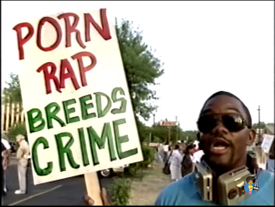 Protesters jockey for time in front of the camera, some saying that rap music is basically to blame for everything morally wrong in America and others saying that people should be allowed to make and consume the art they want to and that the persecution of 2 Live Crew is rooted in racism.